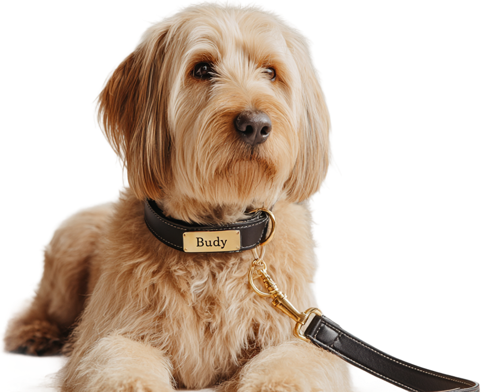 Handcrafted collars, harnesses, coats, and accessories – custom-sized, with premium materials and finishes.